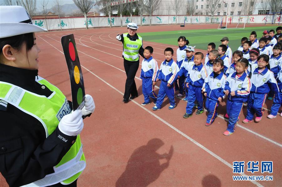 3月28日,山西省广灵县壶泉小学学生在交警的带领下模拟过斑马线。当日是全国中小学生安全教育日,山西省大同市广灵县交警大队组织民警来到辖区中小学校开展内容丰富、形式多样的交通安全宣传教育活动,让学生们了解和掌握交通安全知识,养成文明出行的良好习惯。新华社发(霍飞飞 摄)