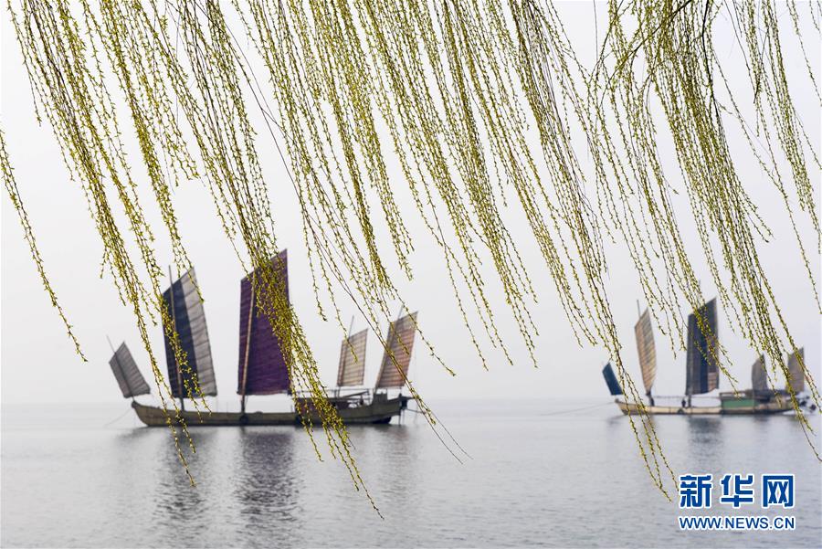 3月28日,江苏无锡太湖,垂柳风中摇曳,帆影随波而行。 新华社发(潘正光摄)