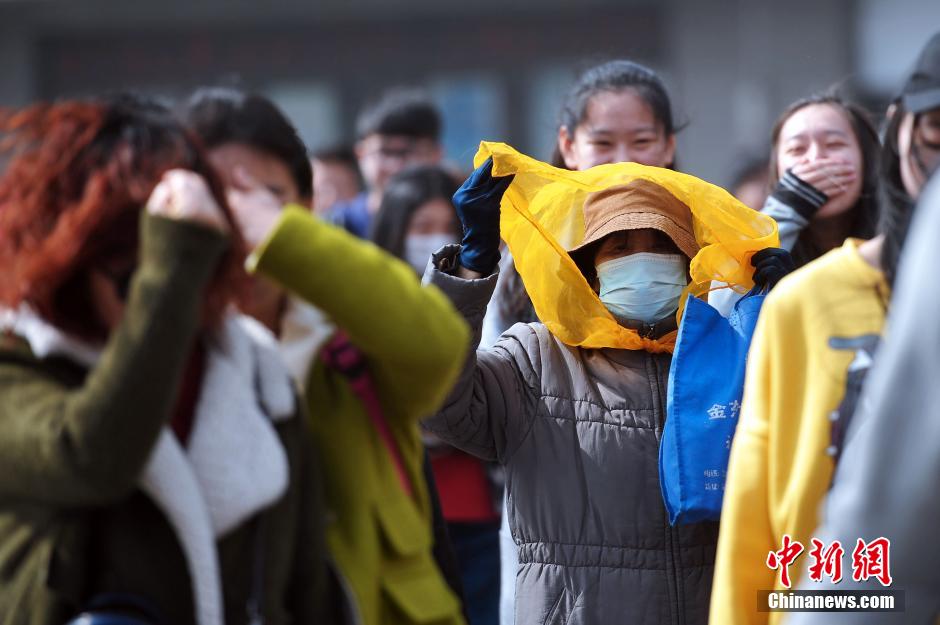3月28日,辽宁沈阳,人们在大风浮尘天气中出行。当天6时,辽宁省气象台发布大风蓝色预警:预计28日8时到20时,沈阳、大连和鞍山等地区西南风6级,阵风7级,并伴有浮尘或扬沙。图为一阵大风吹起了大妈的纱巾。 孙昊声 摄