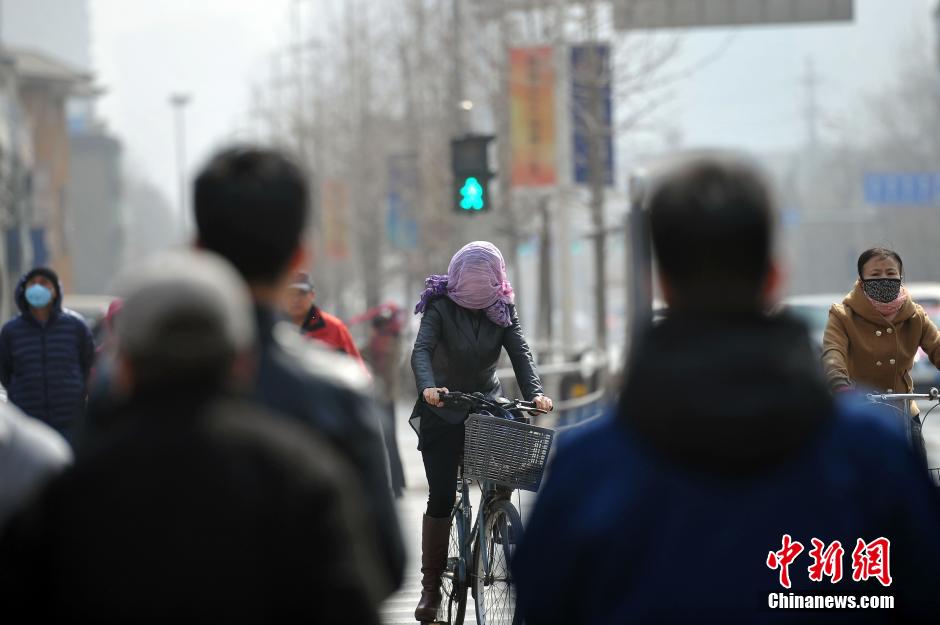 3月28日,辽宁沈阳,人们在大风浮尘天气中出行。当天6时,辽宁省气象台发布大风蓝色预警:预计28日8时到20时,沈阳、大连和鞍山等地区西南风6级,阵风7级,并伴有浮尘或扬沙。图为人们用纱巾或口罩抵御大风扬沙天气。 孙昊声 摄