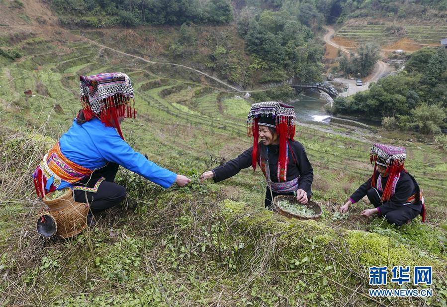 3月28日,广西龙胜各族自治县龙脊镇大柳村的赵维娟(中)和姐妹们在采摘艾叶。艾粑是广西桂林龙胜地区的瑶族传统特色小吃。春耕时节,当地瑶族同胞到田间地头采摘艾草,洗净后切碎,拌入糯米粉中舂成粑粑,包上芝麻或花生馅,用芭蕉叶垫上粑粑,蒸熟即可食用。艾粑入口清香细滑,可理气血祛风驱湿,是一道深受当地民众喜爱的传统小吃。新华社发(石农兵 摄)