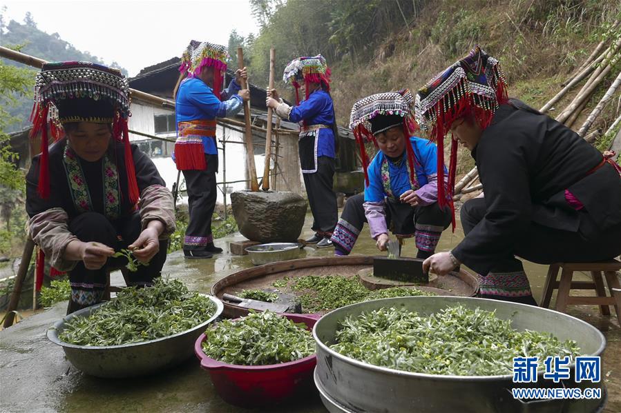 3月28日,广西龙胜各族自治县龙脊镇大柳村的瑶族村民在选艾叶。艾粑是广西桂林龙胜地区的瑶族传统特色小吃。春耕时节,当地瑶族同胞到田间地头采摘艾草,洗净后切碎,拌入糯米粉中舂成粑粑,包上芝麻或花生馅,用芭蕉叶垫上粑粑,蒸熟即可食用。艾粑入口清香细滑,可理气血祛风驱湿,是一道深受当地民众喜爱的传统小吃。新华社发(石农兵 摄)