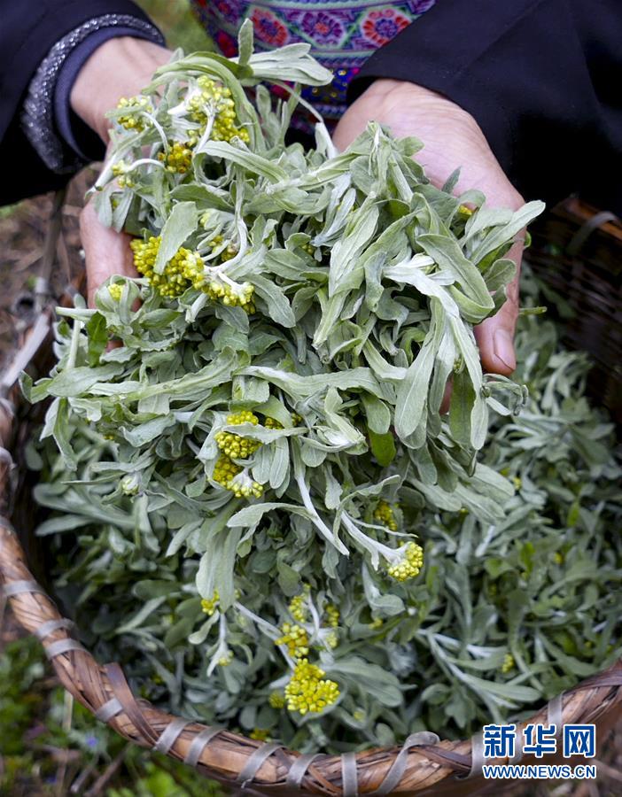 3月28日,广西龙胜各族自治县龙脊镇大柳村村民展示采摘到的艾叶。