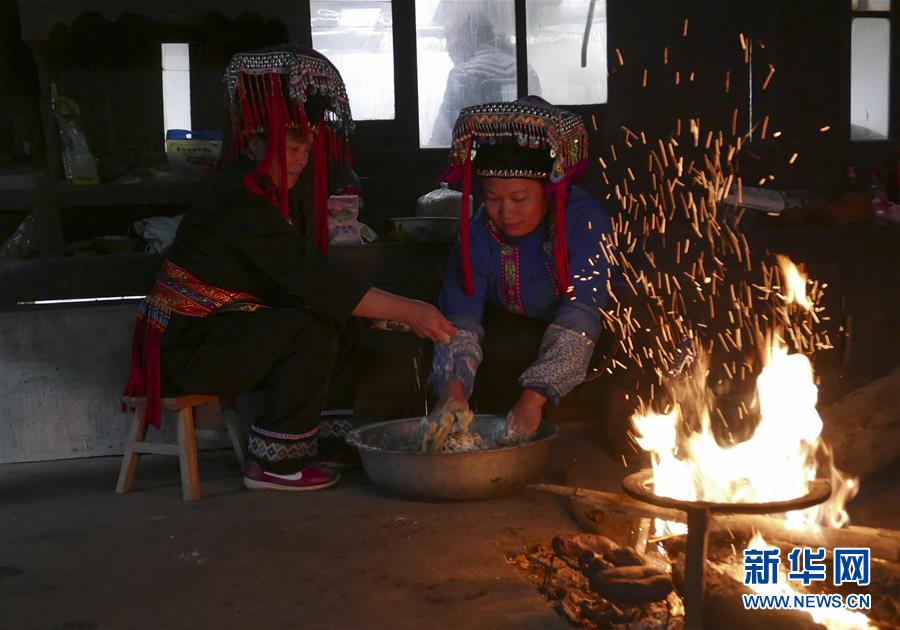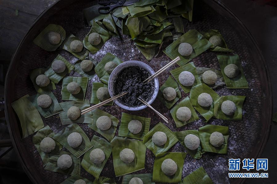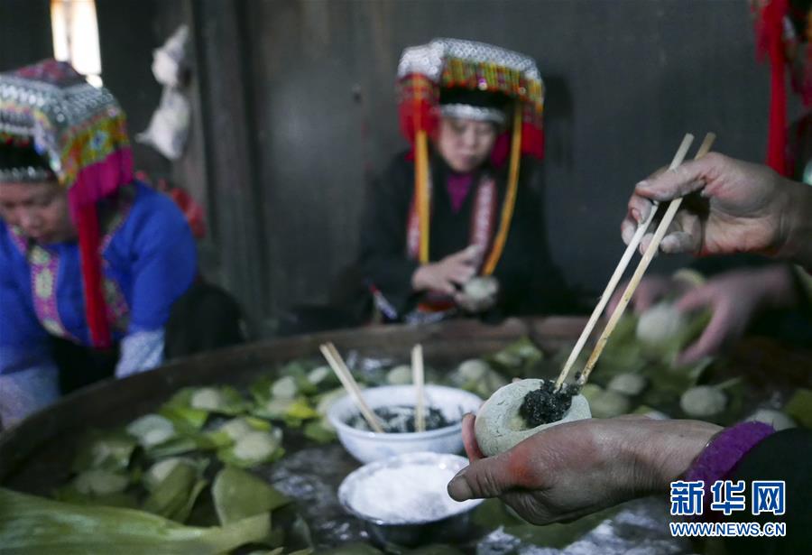 3月28日,广西龙胜各族自治县龙脊镇大柳村的瑶族村民在包艾粑。