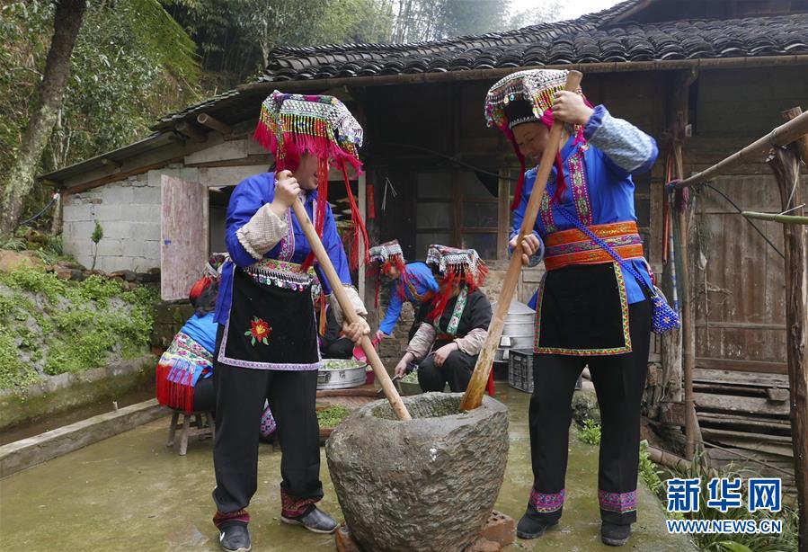 3月28日,广西龙胜各族自治县龙脊镇大柳村的瑶族村民在舂艾叶。