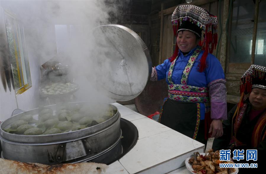 3月28日,广西龙胜各族自治县龙脊镇大柳村的邓艳林在蒸艾粑。