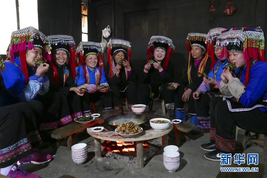 3月28日,广西龙胜各族自治县龙脊镇大柳村瑶族村民在品尝刚做好的艾粑。
