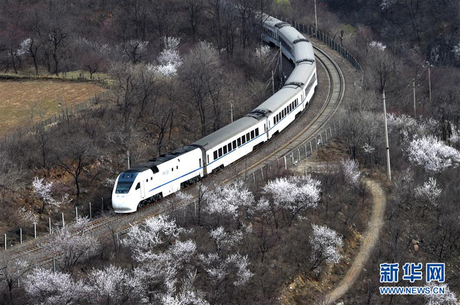 3月28日,一列火车在北京居庸关附近的山花中穿行。在北京居庸关长城附近,花朵遍山绽放,春意盎然,一列列火车穿行其间,驶入春的怀抱。 新华社记者鞠焕宗摄