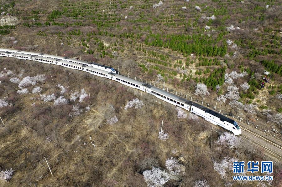 3月28日,两列火车在北京居庸关附近的山花中穿行。在北京居庸关长城附近,花朵遍山绽放,春意盎然,一列列火车穿行其间,驶入春的怀抱。 新华社记者鞠焕宗摄