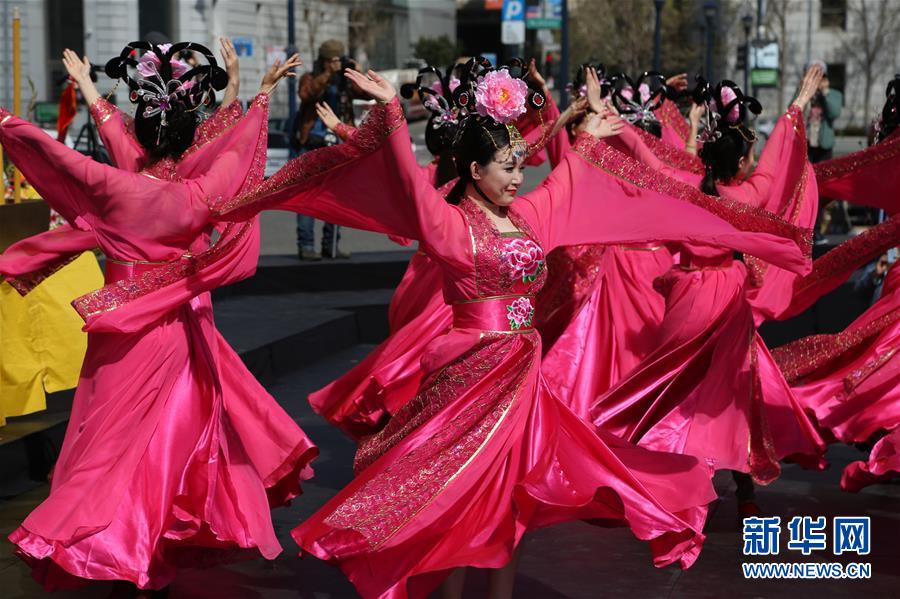 3月27日,在美国旧金山市市政广场,旧金山蓓蓝舞蹈团在拜祖大典“乐舞敬拜”环节中表演。新华社发(刘艺霖摄)