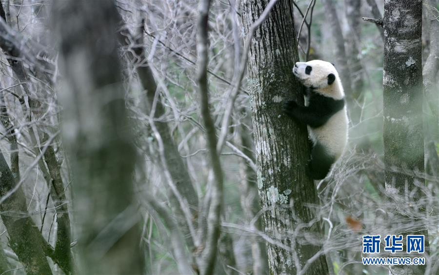 3月28日,一只野生大熊猫幼崽在佛坪县岳坝镇大古坪村攀登树木。