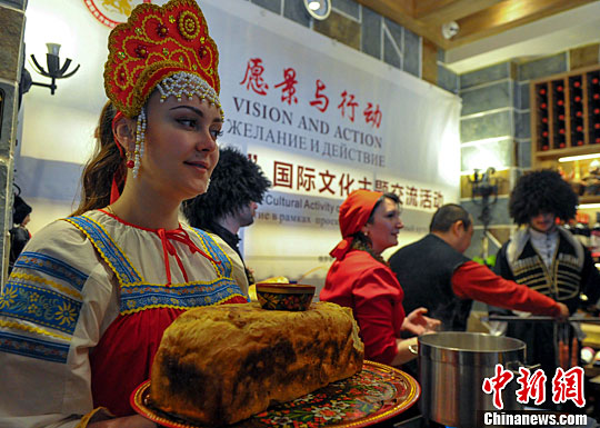 图为格鲁吉亚美女身着传统服饰现场推介正宗东欧美食。 中新社记者 刘新 摄