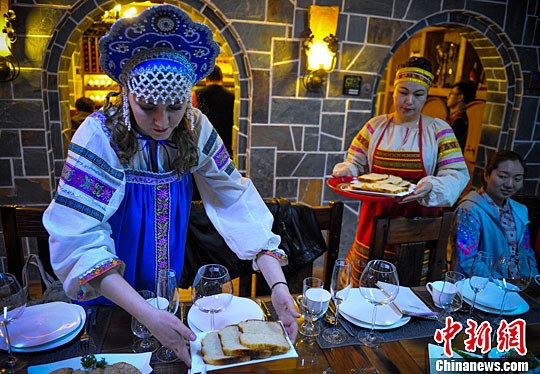 图为来自格鲁吉亚的厨师和服务员身着传统服饰忙碌着,为食客们奉上正宗东欧美食。 中新社记者 刘新 摄