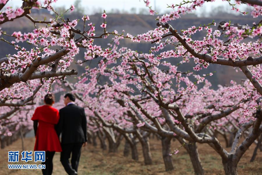 3月29日,游人在山西平陆千亩桃花林里赏花踏青。近日,山西省平陆县黄河岸边的千亩桃花竞相盛开,大片的桃花色若凝霞,处处春意融融,吸引众多游客赏花踏青。 新华社发(刘文礼 摄)