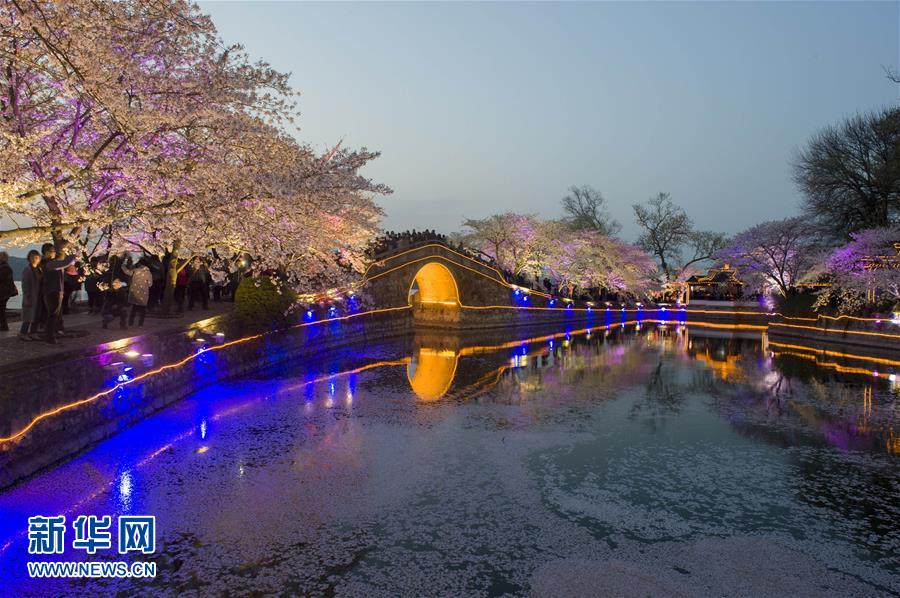 3月29日,游客在无锡太湖鼋头渚景区夜赏樱花。新华社发(潘正光 摄)