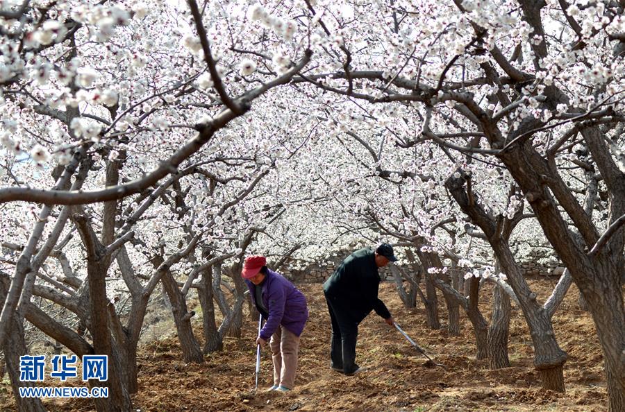3月29日,在山东省沂源县悦庄镇上枝村,农民在田间劳作。近日,山东省沂源县悦庄镇上枝村的杏花盛开,当地农民抢抓农时,穿梭在花间春耕劳作,一派春意融融的景象。 新华社发(赵东山 摄)