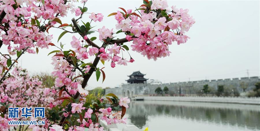 3月29日,苏州环古城河岸盛开的海棠花与古城墙相映成景。近日,江苏苏州春风送暖,环古城河岸的海棠花进入盛花期,呈现出一派春意盎然的景象。 新华社发(杭兴微 摄)