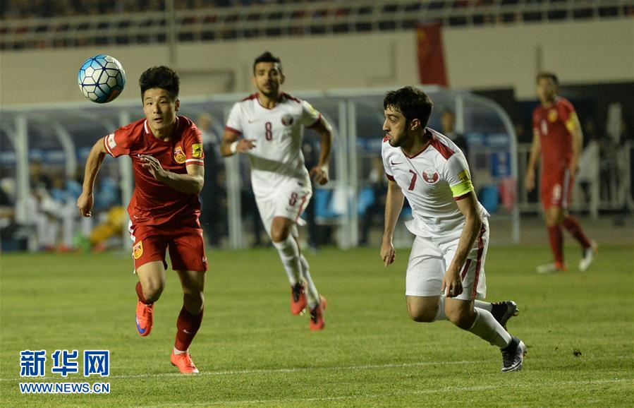 3月29日,中国队球员武磊(左)在比赛中。当日,在陕西省体育场进行的2018年俄罗斯世界杯亚洲区预选赛C组比赛中,中国队以2比0战胜卡塔尔队。 新华社记者李一博摄