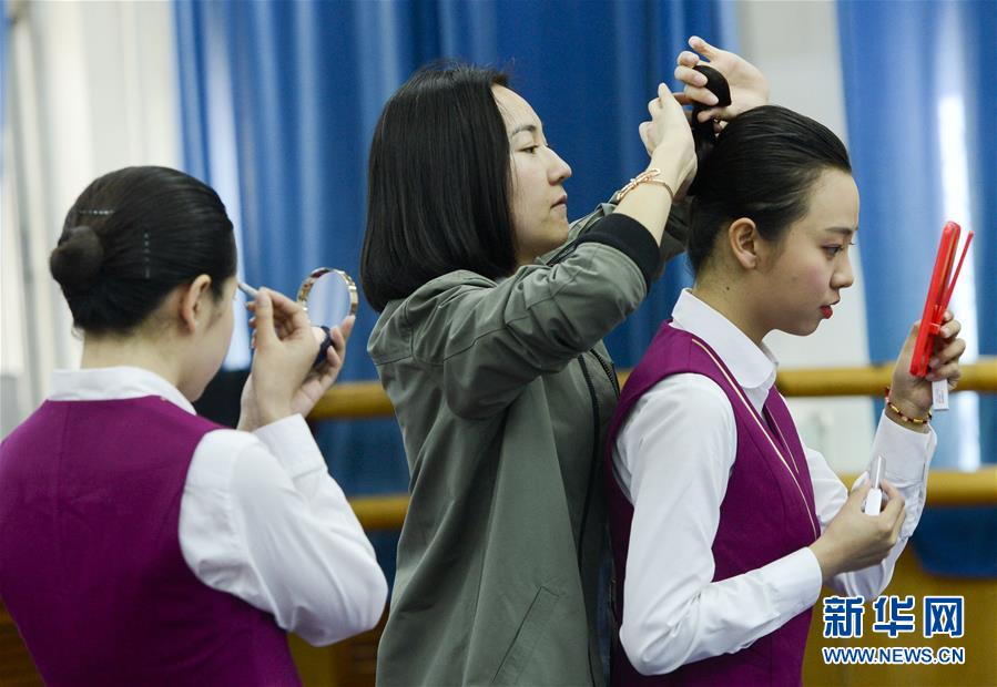 3月29日,南航新疆公司乘务员杜晓伟(中)在帮助考生整理发饰。新华社记者 赵戈 摄
