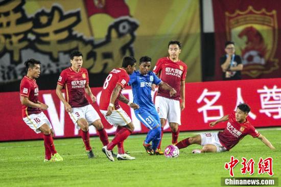 4月1日晚,2016赛季中超联赛第3轮比赛,广州恒大坐镇主场与广州富力展开同城德比。最终广州恒大凭借保利尼奥与马丁内斯的进球,2比0完胜广州富力,马丁内斯的进球是其本赛季首颗运动战进球。图为恒大保利尼奥进球后与高拉特拥抱庆祝。 陈骥旻 摄