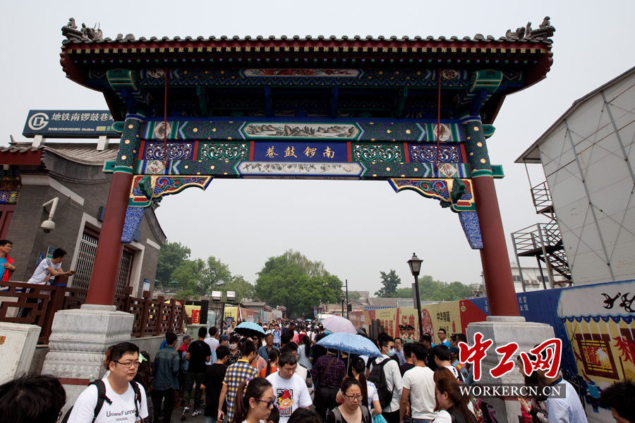 5月1日,北京南锣鼓巷,游客熙熙攘攘。2016五一假期是南锣鼓巷主动摘牌,停止接待旅游团后的首个假期。但许多导游将旅游团带到胡同口,让游客自行进入参观,南锣鼓巷内已经看不到导游旗。居民和商铺都表示,限制令实行一周,游客并未减少,与以往差不多。 中工网记者 李雪峰 摄