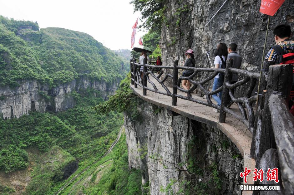 5月4日,游客走在生态栈道上观光。当日,中国首个矿山怀旧小镇——朱砂古镇(万山国家矿山公园)在贵州万山开园,矿山博物馆、苏联专家楼、970公里的“地下长城”等景点向海内外游客开放。据了解,“五一”小长假期间,万山国家矿山公园(朱砂古镇)接待海内外游客近20万人次。 中新社记者 贺俊怡 摄