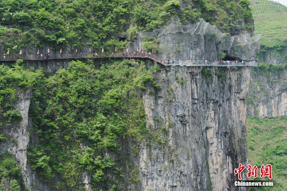 5月4日,游客在玻璃栈道上观光。当日,中国首个矿山怀旧小镇——朱砂古镇(万山国家矿山公园)在贵州万山开园,矿山博物馆、苏联专家楼、970公里的“地下长城”等景点向海内外游客开放。据了解,“五一”小长假期间,万山国家矿山公园(朱砂古镇)接待海内外游客近20万人次。 中新社记者 贺俊怡 摄