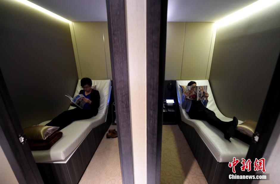 5月4日,白领一族在香港中环一家“午休店”内看杂志小憩。该“午休店”近期在中环金融区开业,店内环境清幽、香薰怡人,为上班族提供私人空间,放松精神。 中新社记者 张宇 摄