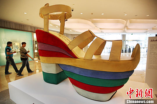 5月5日,一只按照原型比例放大的凉鞋亮相南京德基广场,引来市民们好奇的目光。中新社记者 泱波 摄