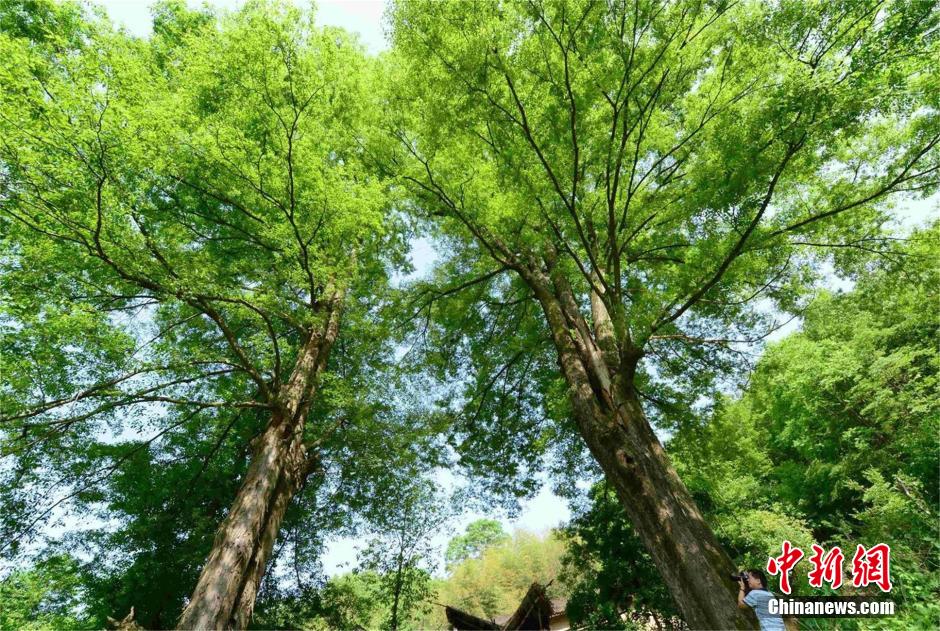 近日,湖北省保康县林业部门工作人员在该县黄堡镇吴家岭村三组,发现两棵树龄分别达1300年和1100年的野生榉树。经实测,两棵树间隔7米,直径分别为1.54米和1.26米。专家证实,在湖北现存榉树中,此两棵系第一和第二大的榉树。榉树属国家二级重点保护植物,目前该县林业部门已对两棵树挂牌保护。陈泉霖 摄