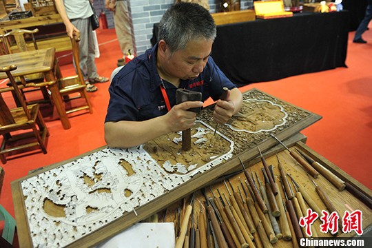 成都木雕艺人展示手工雕刻技艺。 中新社记者 张浪 摄