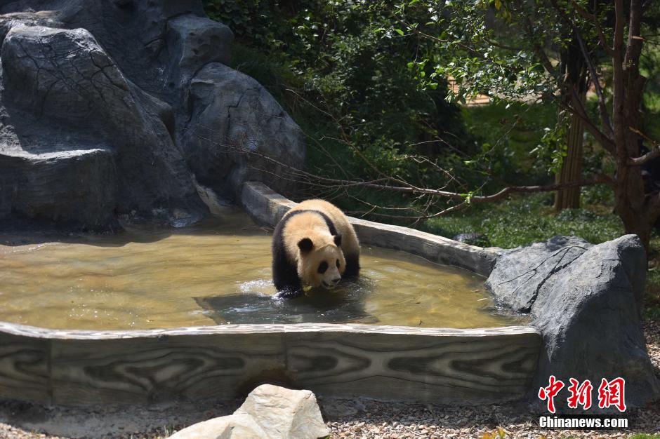 5月5日,“囡囡”在水池里嬉水。当日是“立夏”节气,昆明天气逐渐变热。云南野生动物园的大熊猫“囡囡”,在大熊猫园区里玩水消暑。 中新社记者 刘冉阳 摄