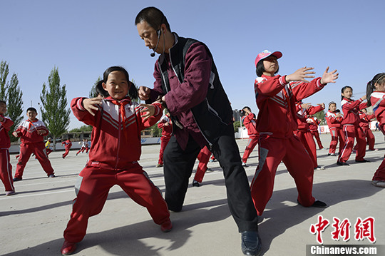 陈氏太极传承人教授小学生太极动作。 中新社记者 刘文华 摄