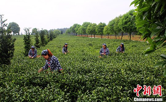 江西省永丰县教师变身“采茶女”在该县鹿冈乡茶园里体验采茶。 李建平 摄