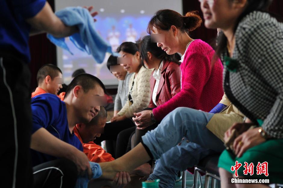 5月5日,在山西省强制隔离戒毒所,戒毒学员拥吻母亲表达忏悔与感恩之心。在“母亲节”即将到来之际,当地司法机关通过感恩教育活动,鼓励学员积极戒毒,早日回归社会。图为戒毒学员为母亲洗脚表达感恩之心。 韦亮 摄