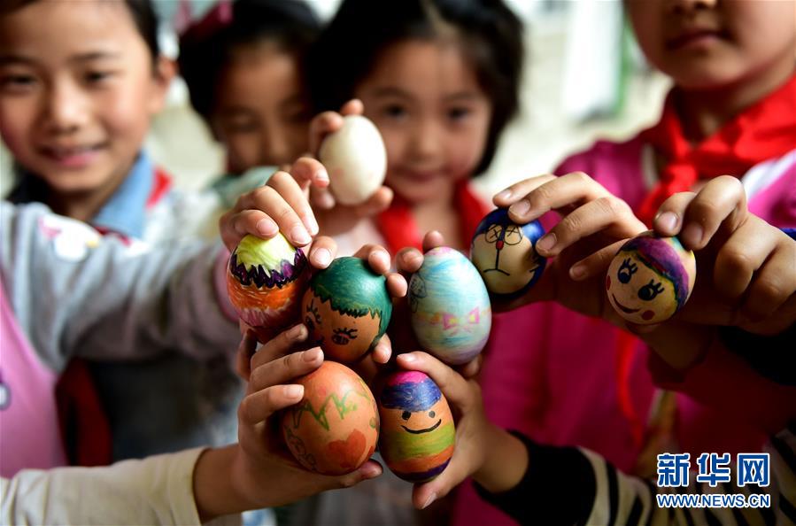 5月5日,合肥市香樟雅苑小学学生在展示自己手绘的彩蛋。当日是二十四节气中的立夏,安徽合肥市香樟雅苑小学开展“斗彩蛋”等传统民俗活动,让孩子们在游戏中了解立夏节气的由来和民俗习惯。新华社记者刘军喜摄