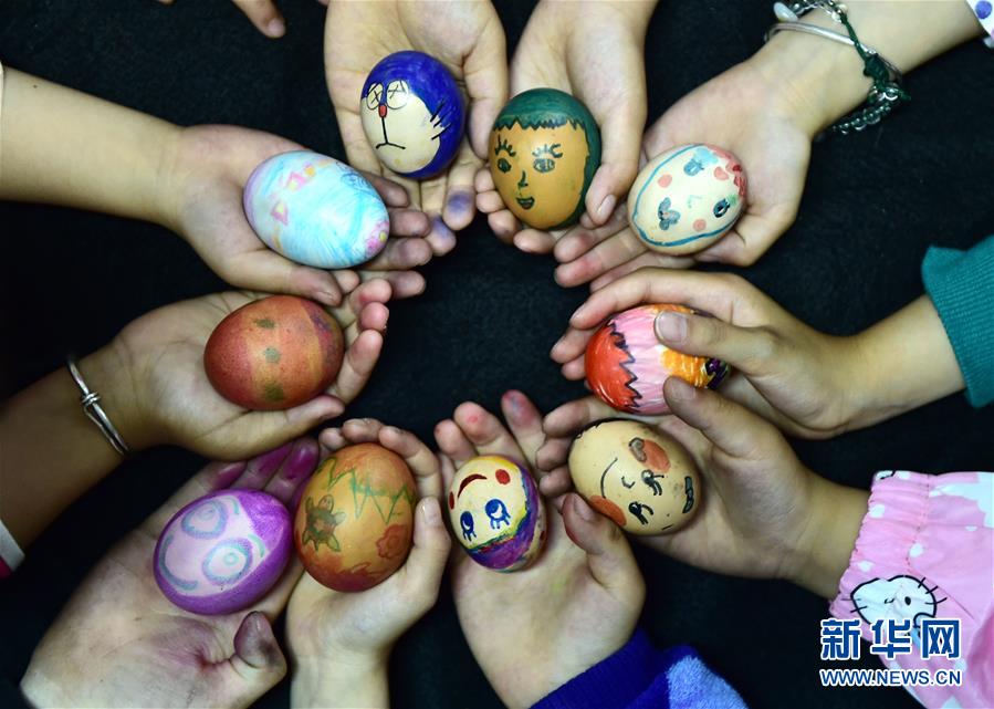 5月5日,合肥市香樟雅苑小学学生在展示自己手绘的彩蛋。当日是二十四节气中的立夏,安徽合肥市香樟雅苑小学开展“斗彩蛋”等传统民俗活动,让孩子们在游戏中了解立夏节气的由来和民俗习惯。新华社记者刘军喜摄