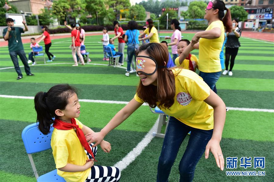 5月5日,在合肥市华府骏苑小学,一名母亲在趣味比赛中蒙眼找到自己的孩子。当日,安徽省合肥市举办丰富多彩的活动,迎接即将到来的母亲节。 新华社记者刘军喜摄