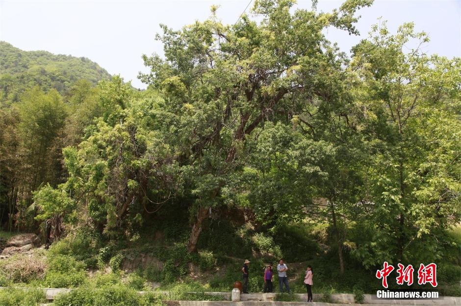 湖北竹山县林业技术员近日在该县双台乡境内首次发现一棵800余年的紫藤。经测量,该紫藤胸径39.8厘米,冠幅200余平方米,其攀援缠绕旁边两棵相隔3米左右的飞蛾槭树木上,常年相依为命,和睦共处。程平 摄