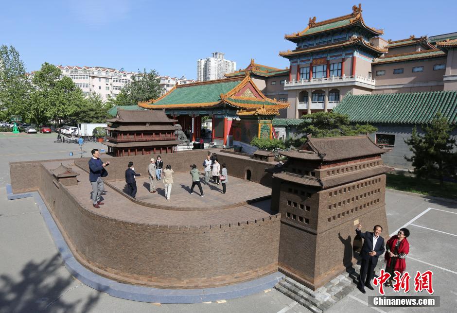 5月6日,由中国紫檀博物馆馆长陈丽华女士监制的“紫檀及阴沉木制正阳门”在中国紫檀博物馆广场首次亮相与观众见面。这座以1:10比例复制的正阳门包括城楼、箭楼和瓮城三个部分,整个城门南北长18米,东西阔17.2米,高5米。正阳门的展出,也标志着中国紫檀博物馆“内九外七”16座老北京城门楼项目的圆满完成。图为观众参观“紫檀及阴沉木制正阳门”。中新社记者 赵隽 摄