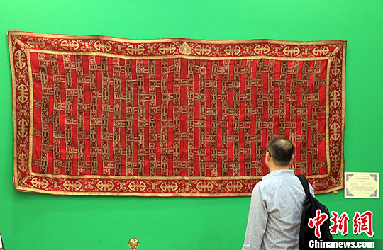 5月6日,“圣洁甘孜走进上海”系列活动在上海启幕。图为“藏传佛教宫廷精品文物”展中的金丝袈裟吸引观众。中新社记者 潘索菲 摄