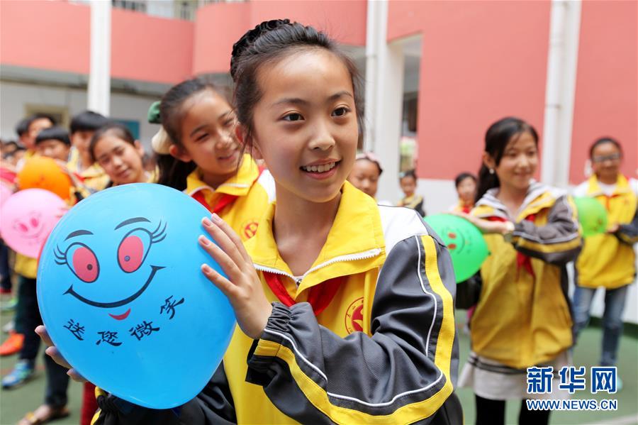 5月6日,山东省枣庄市君山路小学的学生在展示自编的“笑脸”气球健身操。当日,山东省枣庄市君山路小学开展“传递微笑健康成长”活动,小学生们利用“笑脸”气球进行“传递微笑”互动游戏,自编了“笑脸”气球操。这项活动旨在引导学生们从小培养健康乐观的心态,用微笑迎接5月8日“世界微笑日”的到来。新华社发(孙中喆 摄)