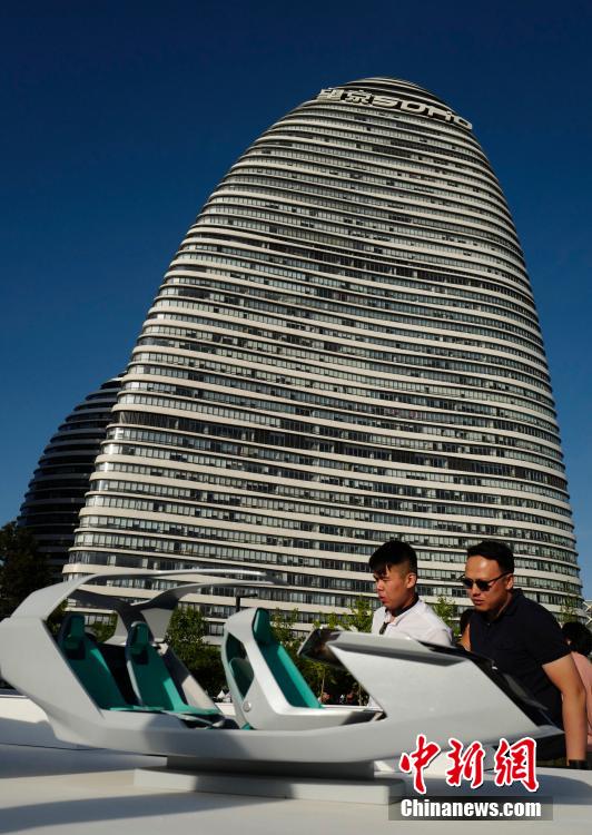5月6日,“央美创客——望京创新艺术节”在北京地标性的望京SOHO建筑群附近开幕,由中央美术学院的学生创作的各类型艺术品在此展示。一件未来概念汽车的创意设计展品吸引人们驻足参观。 中新社记者 侯宇 摄
