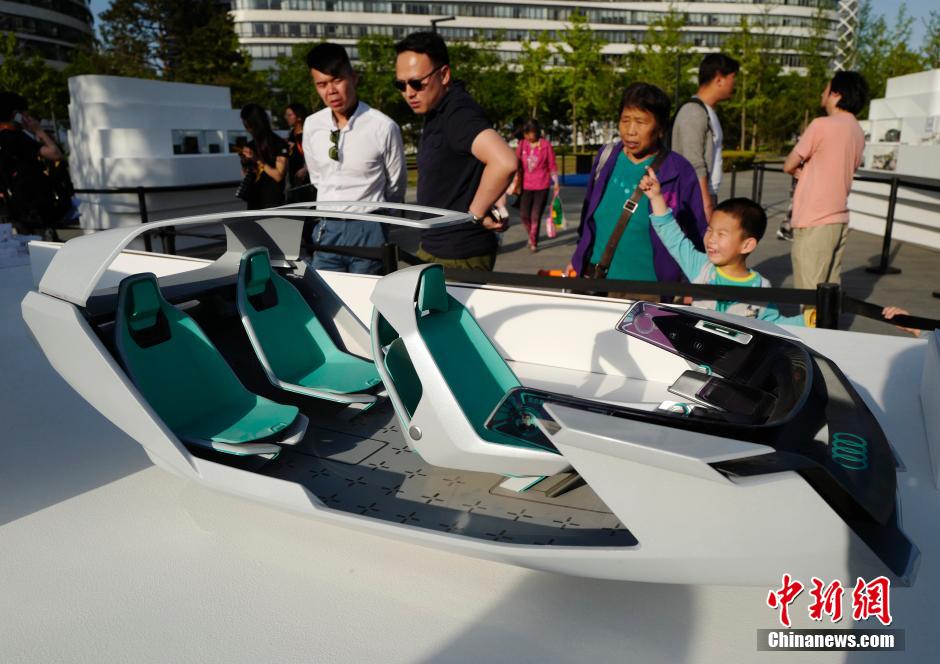 5月6日,“央美创客——望京创新艺术节”在北京地标性的望京SOHO建筑群附近开幕,由中央美术学院的学生创作的各类型艺术品在此展示。一件未来概念汽车的创意设计展品吸引人们驻足参观。 中新社记者 侯宇 摄
