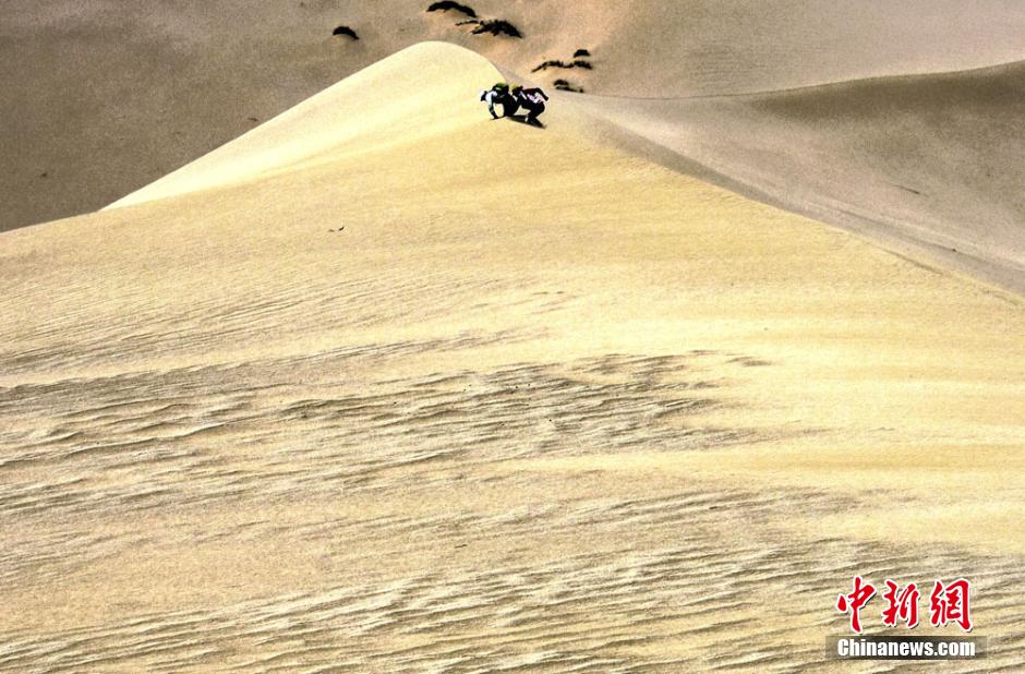 5月7日,甘肃肃北县组织开展第二届“喜迎文博会·亲近母亲河”徒步体验活动。300多名徒步爱好者从肃北县长沙梁2号水电站出发,穿越戈壁、趟过党河、翻越沙山,历时7个多小时到达敦煌西千佛洞,全程约28公里。图为翻越沙山。 李彬 摄