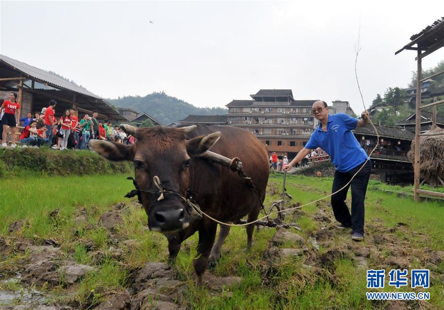 5月7日,一名游客在广西三江侗族自治县程阳八寨体验耕田。当日,广西三江侗族自治县程阳景区举办传统“侗耕节”,当地群众以百人纺纱、耕作体验、捶糍粑及民俗歌舞表演等多彩节目,演绎侗族原生态农耕文化,吸引游客前来观赏体验。新华社发(梁克川 摄)