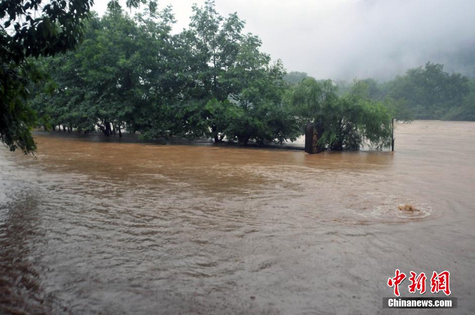 武夷山兰汤桥下“武夷山漂流”的石牌被淹。 张丽君 摄