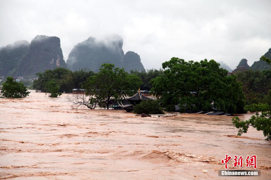 广西阳朔暴雨引发洪水 汽车遭没顶