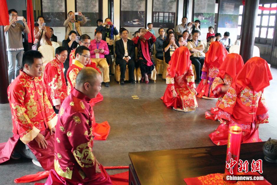 5月8日,来自苏州、扬州和镇江等地的五对新人在鸟语花香的江南园林—拙政园,举行了一场别开生面的婚礼——全国首个景区“零碳婚典”。每对新人各捐资1111元(象征着“一心一意、一生一世”),共计5555元,由中国绿色碳汇基金会组织在云南大理南涧县种植5亩云南松,今后两年内将本次婚典产生的12吨二氧化碳排放全部吸收,以实现“零碳婚礼”的目标。图为新郎新娘拜堂。
