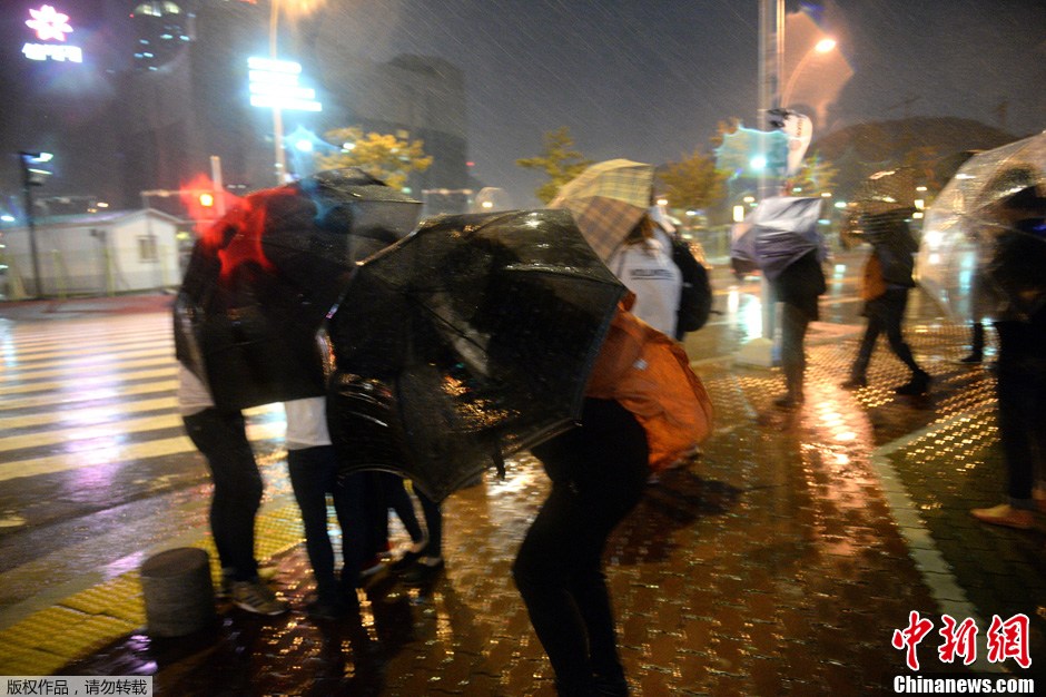当地时间2013年10月8日,韩国釜山,台风“丹娜丝”即将登陆,韩国民众提前感受到了台风的厉害。据悉,台风“丹娜丝”中心风力高达每小时180公里。